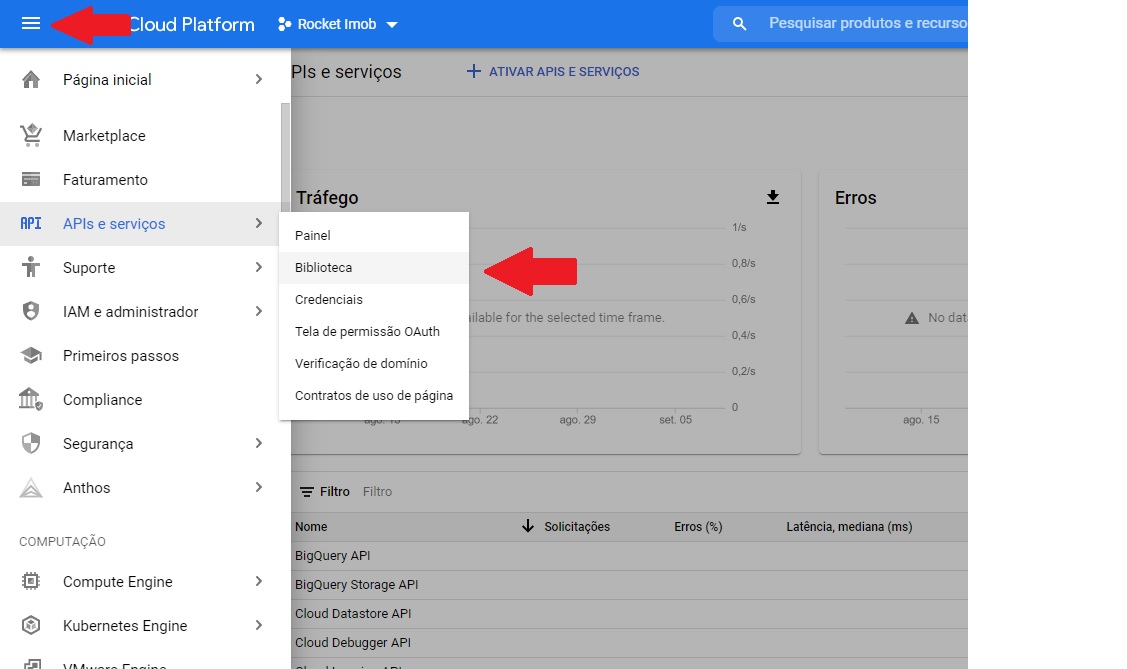 Depois de criado e/ou selecionado o respectivo Projeto, expanda o menu lateral e navegue até APIs e Serviços >> Biblioteca: