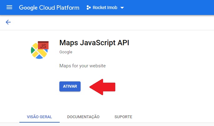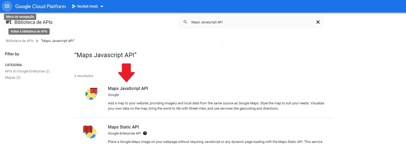Na tela seguinte, procure por “Maps Javascript API”, nos resultados clique sobre o indicado na imagem abaixo: