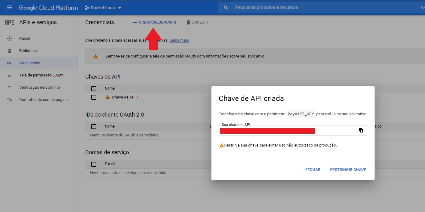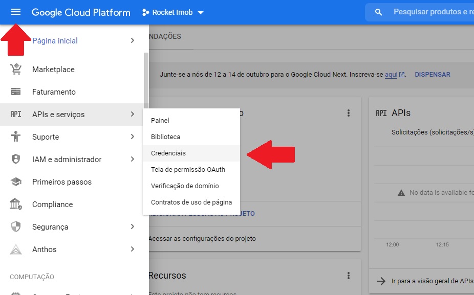 Aguarde o fim da ativação a API e expanda novamente o menu lateral, navegue até APIs e Serviços >> Credenciais: