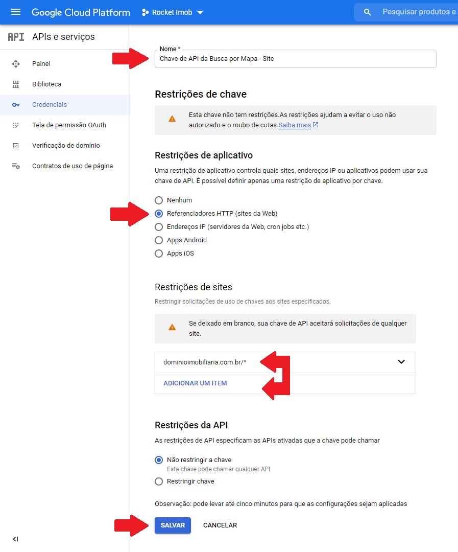 Esta próxima configuração é extremamente importante, sem ela sua chave de API poderá ser utilizada por terceiros, então realize e confira com bastante atenção. Na imagem a seguir, defina um nome para a chave que te ajude a identificar onde ela é utilizada na sua organização, marque para restringir o acesso por Referenciadores HTTP e libere o acesso ao uso no domínio principal de sua imobiliária, lembrando que precisa adicionar /* ao final. Feito isso, clique em Salvar.