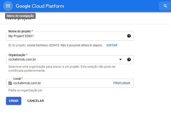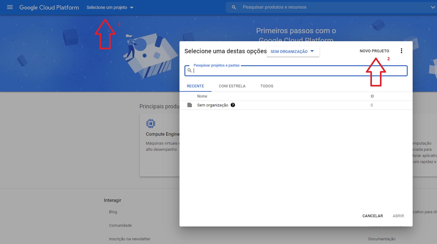 Ao acessar o painel do Google Cloud, crie um Projeto ou selecione um já existente.