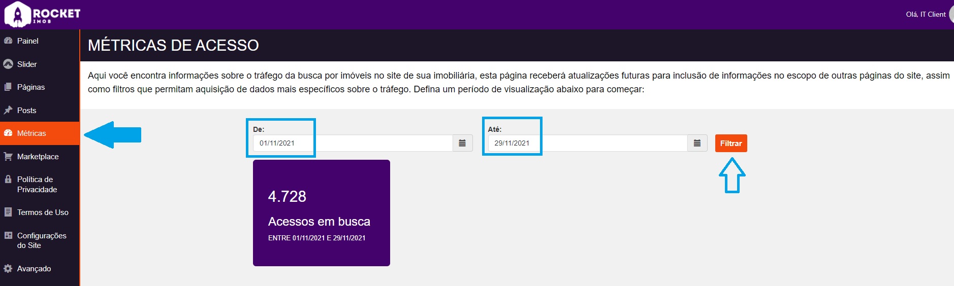 Escolha data inicial e final relativas ao espaço de 30 dias e clique em filtrar, você obterá o número de acessos contabilizados na busca do site de sua imobiliária para o período selecionado.