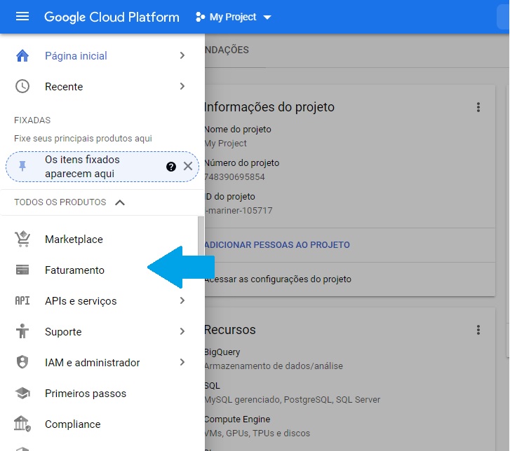 Compreendidas as possibilidades de custos, agora só falta configurar a conta de faturamento para a chave de API que geramos passe a funcionar. No console do Google Cloud acesse o item “Faturamento” no menu lateral: