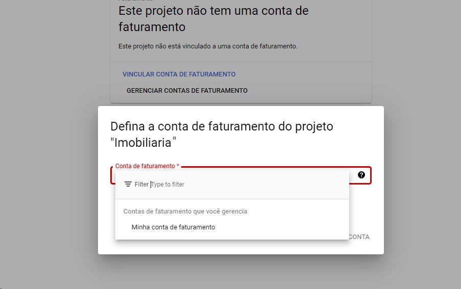 Depois de criada, vincule a conta de faturamento ao Projeto: