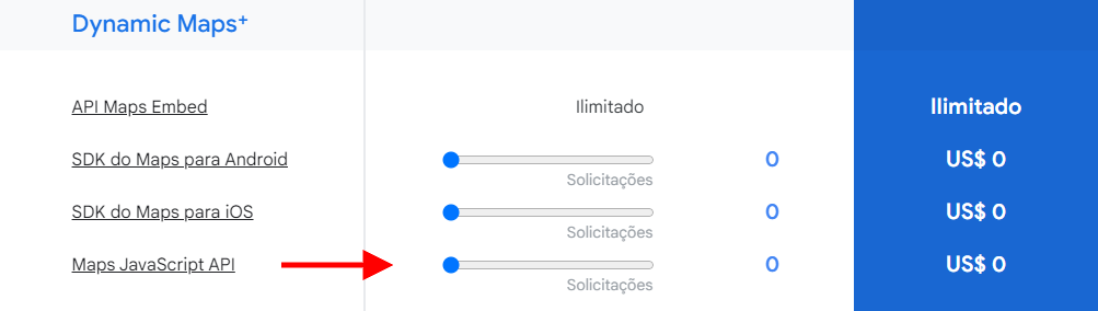 Desça a página e vá em “Maps JavaScript API” e use o slider para verificar os valores.